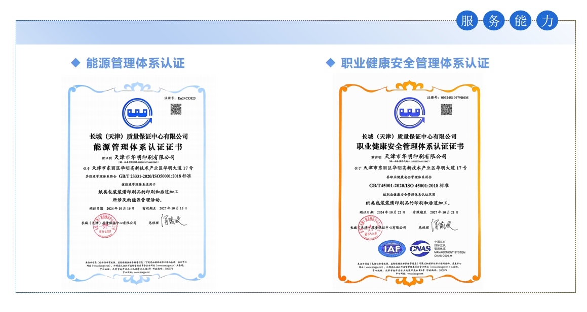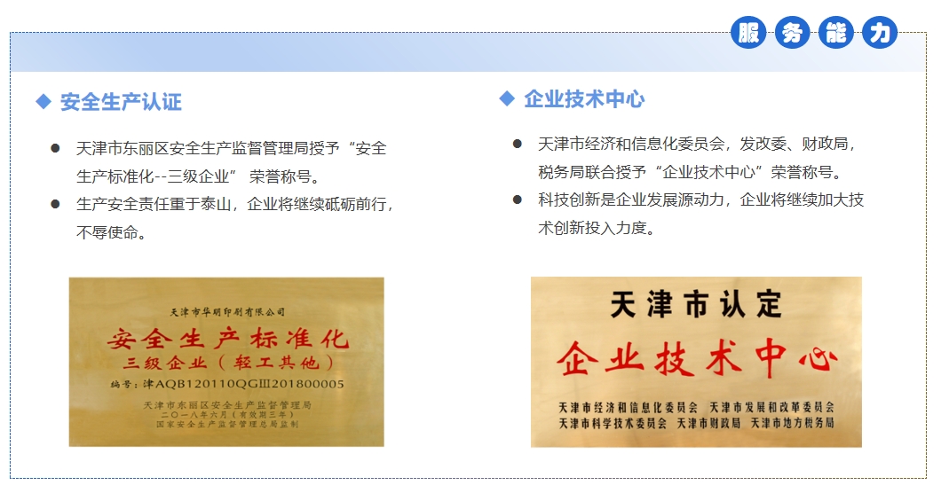 天津市華明印刷有限公司創(chuàng)立于1997年,坐落在交通便利的華明高新區(qū),是一家集研發(fā)設計,印刷及印后為一體的包裝型企業(yè),主要業(yè)務覆蓋醫(yī)療,食品,電子,日化品等諸多行業(yè),我們堅持以客戶為中心,以承擔責任為本,專注于質量和成本,持續(xù)改善,創(chuàng)新發(fā)展,多年來得到眾多客戶的信賴和支持,成為知名企業(yè)的優(yōu)秀供應商和戰(zhàn)略合作伙伴。