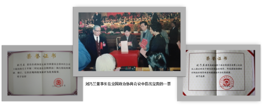 劉乃蘭董事長連續(xù)三屆當(dāng)選全國政協(xié)委員(1998—2013年),為了加強(qiáng)參政議政能力,她經(jīng)常走進(jìn)基層,了解難點(diǎn)、重點(diǎn)問題,深入調(diào)研、走訪、論證,以嚴(yán)謹(jǐn)負(fù)責(zé)的態(tài)度提出大量有價值、有分量、與時俱進(jìn)、順應(yīng)民生的優(yōu)秀提案。 15年來共向全國政協(xié)會議提交提案和大會發(fā)言近百份,其中《關(guān)于開展村民委員會組織法執(zhí)行情況的調(diào)研、修訂、完善法規(guī)》和《關(guān)于強(qiáng)化村黨組織領(lǐng)導(dǎo),形成團(tuán)結(jié)協(xié)調(diào)的村級組織體系》兩份提案獲得“全國優(yōu)秀提案獎” ,受到黨和國家的高度重視,體現(xiàn)了一名共產(chǎn)黨員與優(yōu)秀企業(yè)家的政治素養(yǎng)與普世情懷。